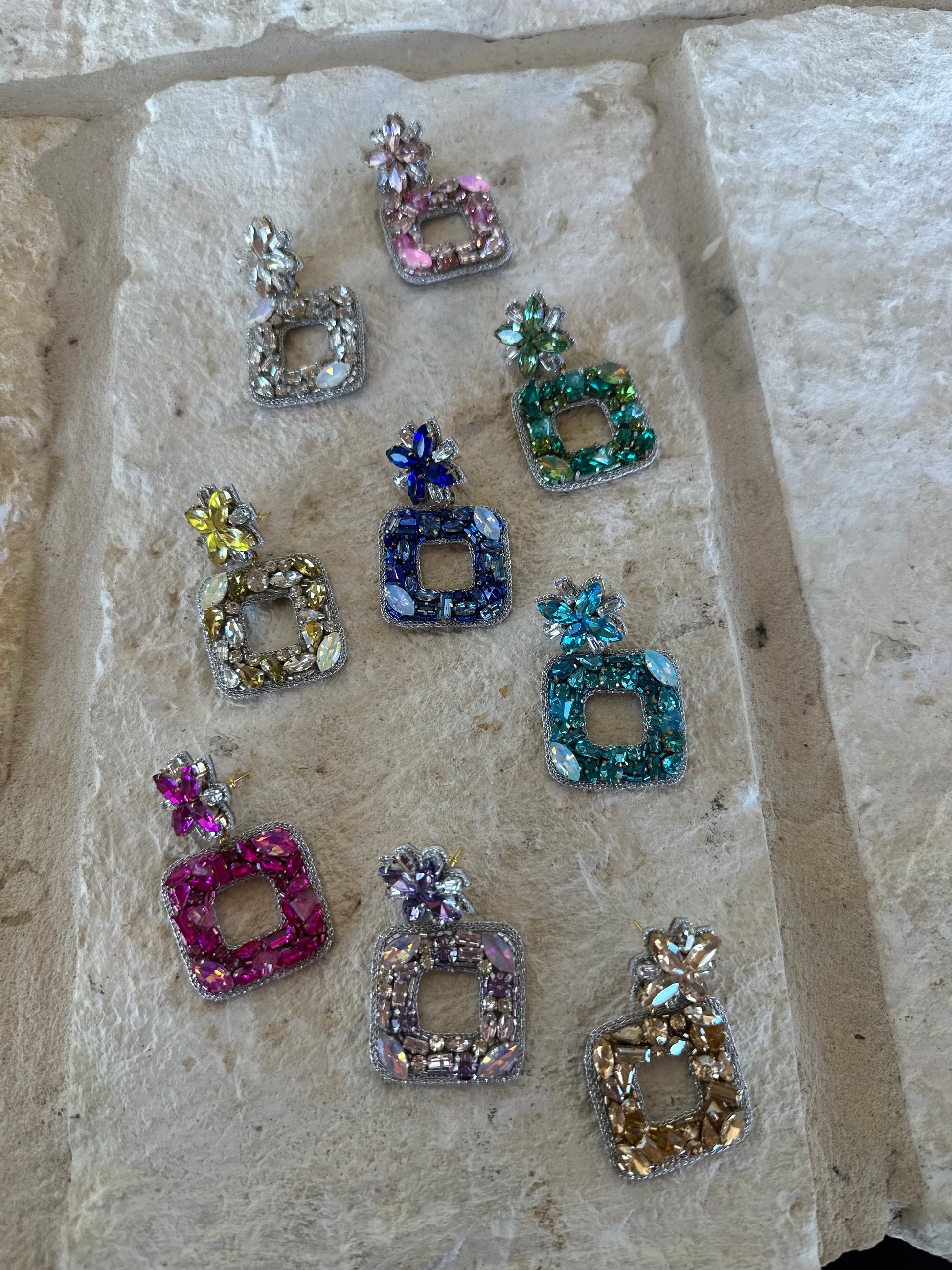 Make a dazzling statement with the Aurora Dangle Gem Earrings, a breathtaking blend of elegance and bold design. These stunning earrings feature radiant purple and iridescent gemstones, intricately arranged in a chic square shape with a sparkling floral accent at the top. The shimmering beaded details catch the light beautifully, making them the perfect accessory for any occasion. Designed with comfort in mind, they include a soft suede backing and hypoallergenic 18K gold-plated posts, ensuring a lightweight and irritation-free wear. Whether dressing up for an event or adding a touch of glamour to your everyday look, these earrings will have you shining in every moment!