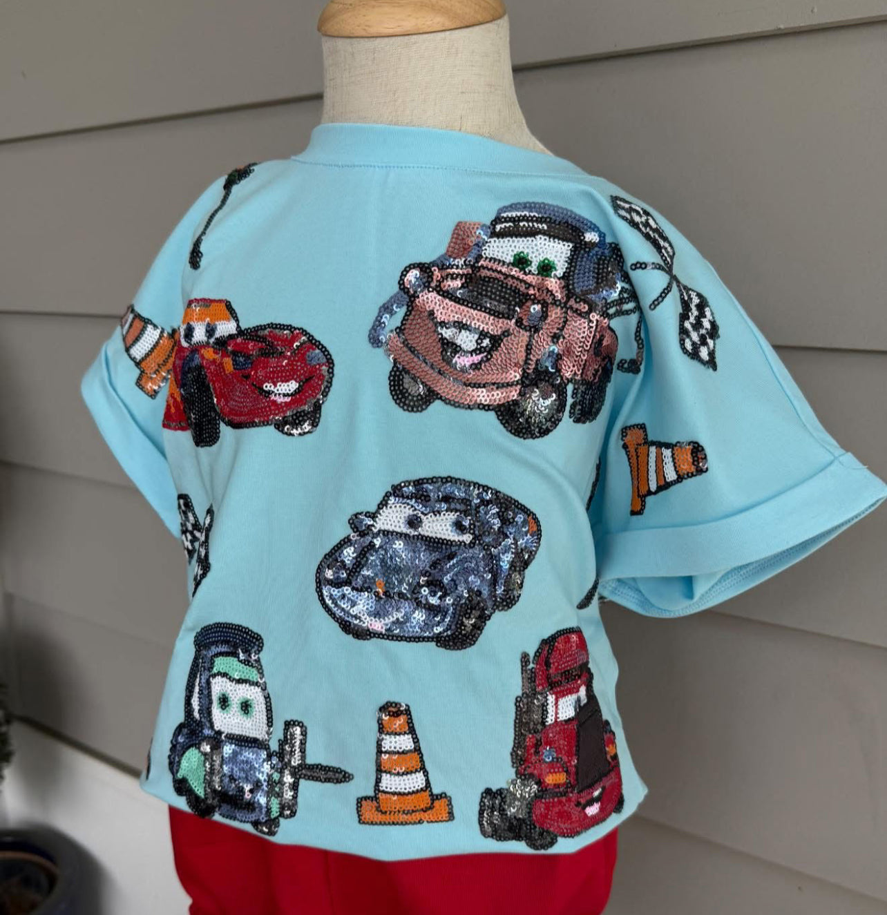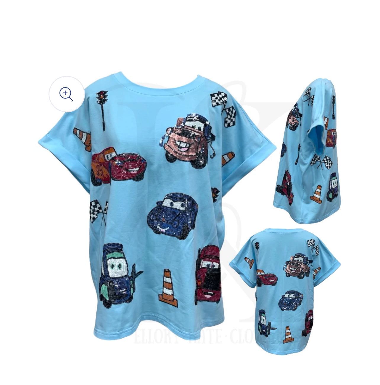 Rev up your front with our cars sequin shirt. This playful sky blue tee features animated race cars, tow trucks, and road signs brought to life with dazzling sequins for an extra touch of sparkle.