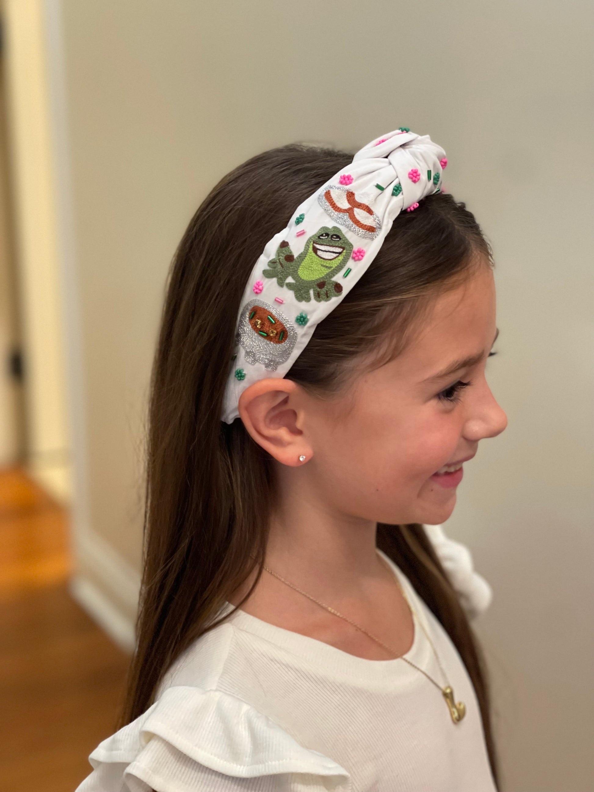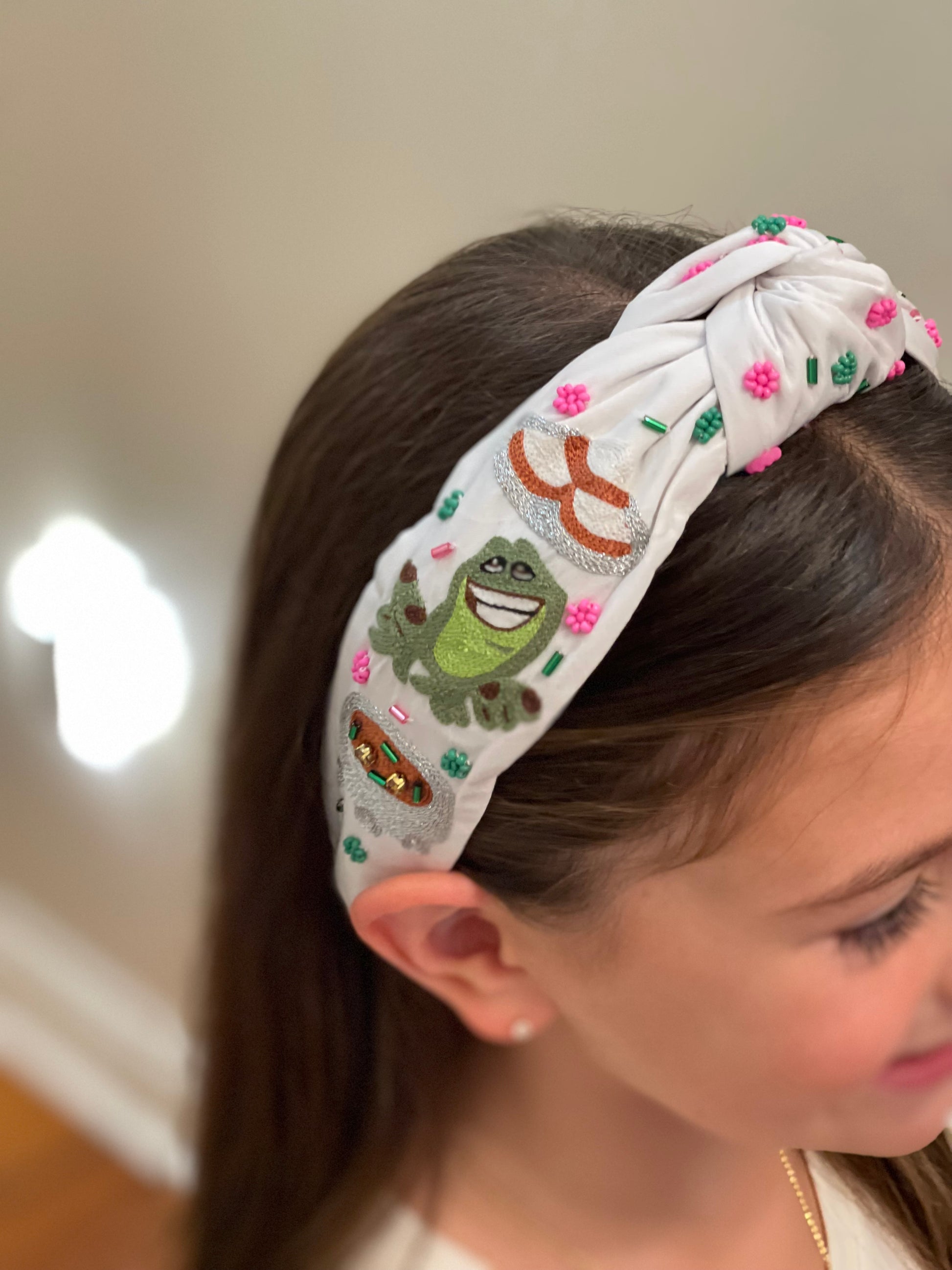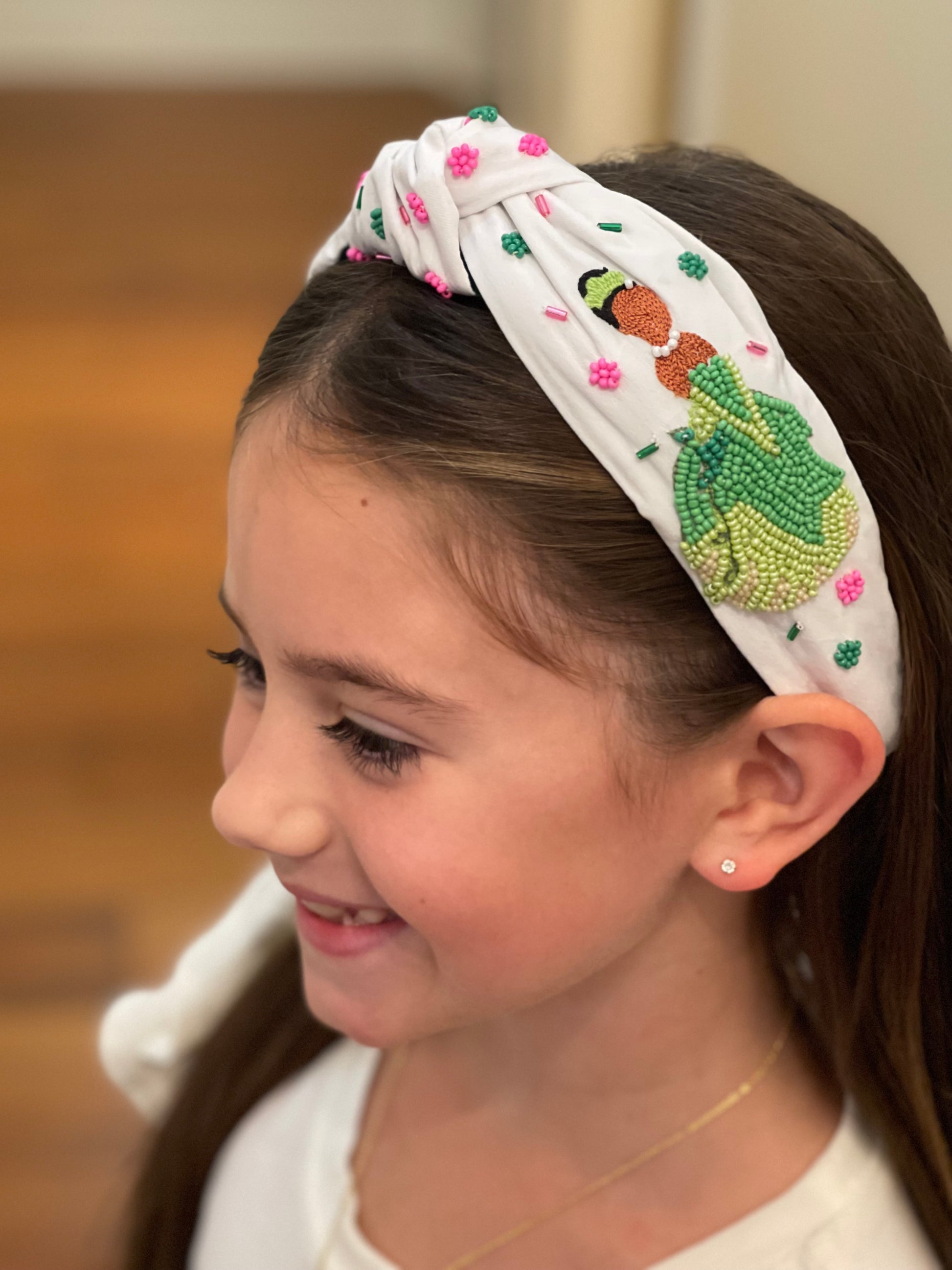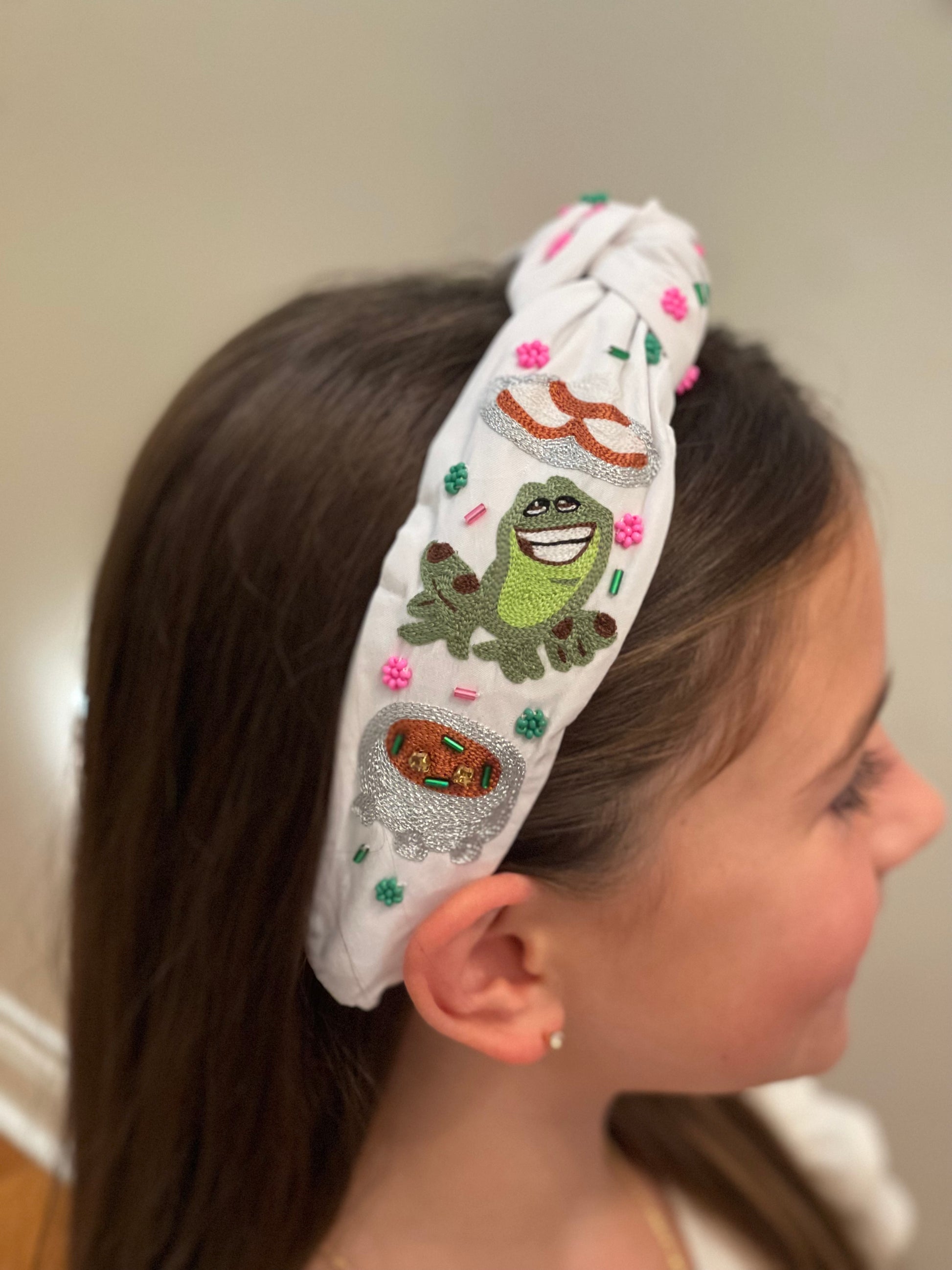 Add a touch of playful charm to your look with this whimsical embroidered headband. Featuring bright bead accents and detailed stitching, it showcases a cheerful frog, a sparkling gumbo, and a graceful princess design—perfect for anyone who loves fairytale vibes. The knotted top adds a trendy twist, while the soft fabric ensures comfortable all-day wear. Whether you’re dressing up for a special outing or adding a fun accessory to your everyday style, this headband brings a little magic and sparkle to every outfit.