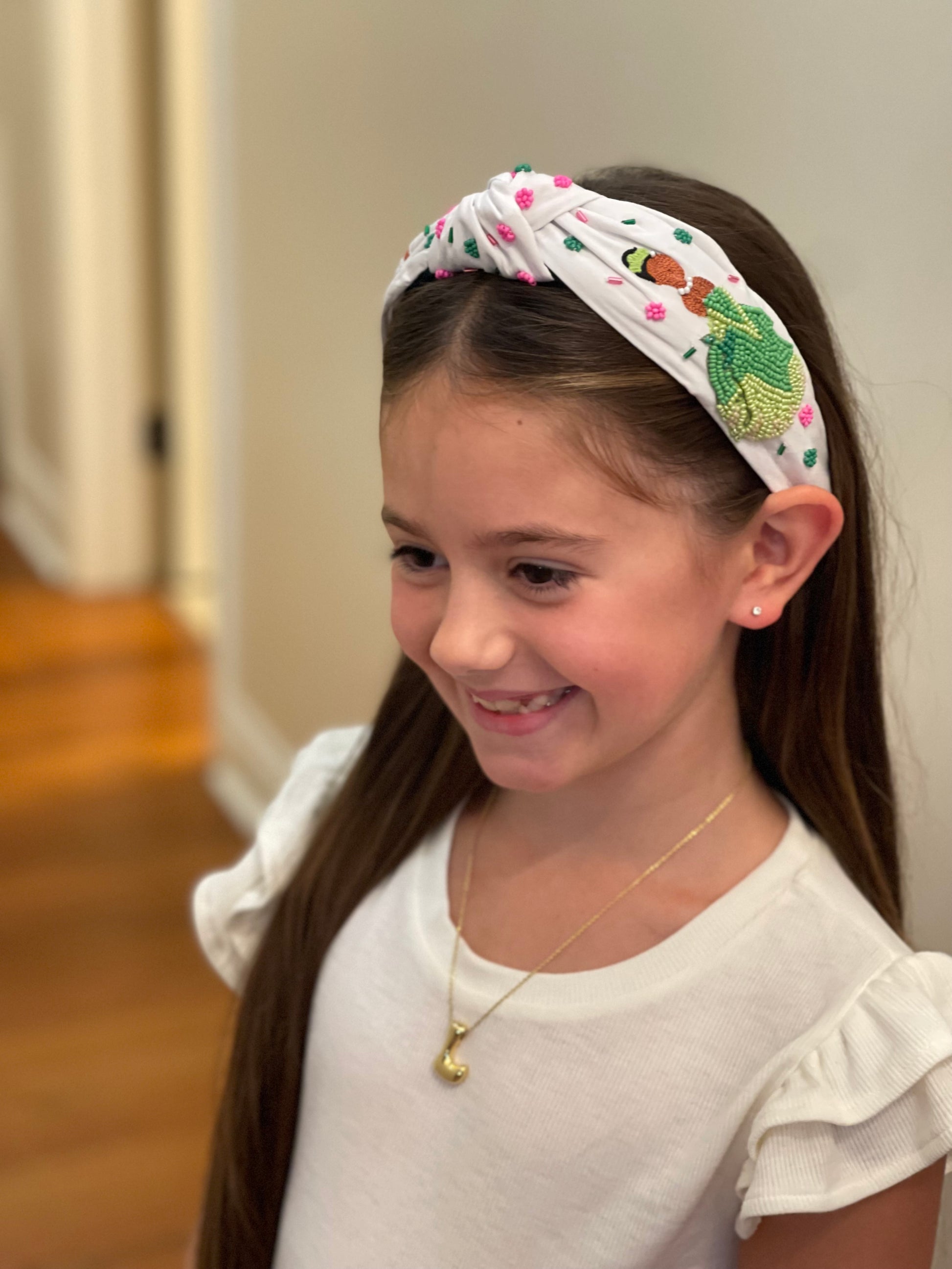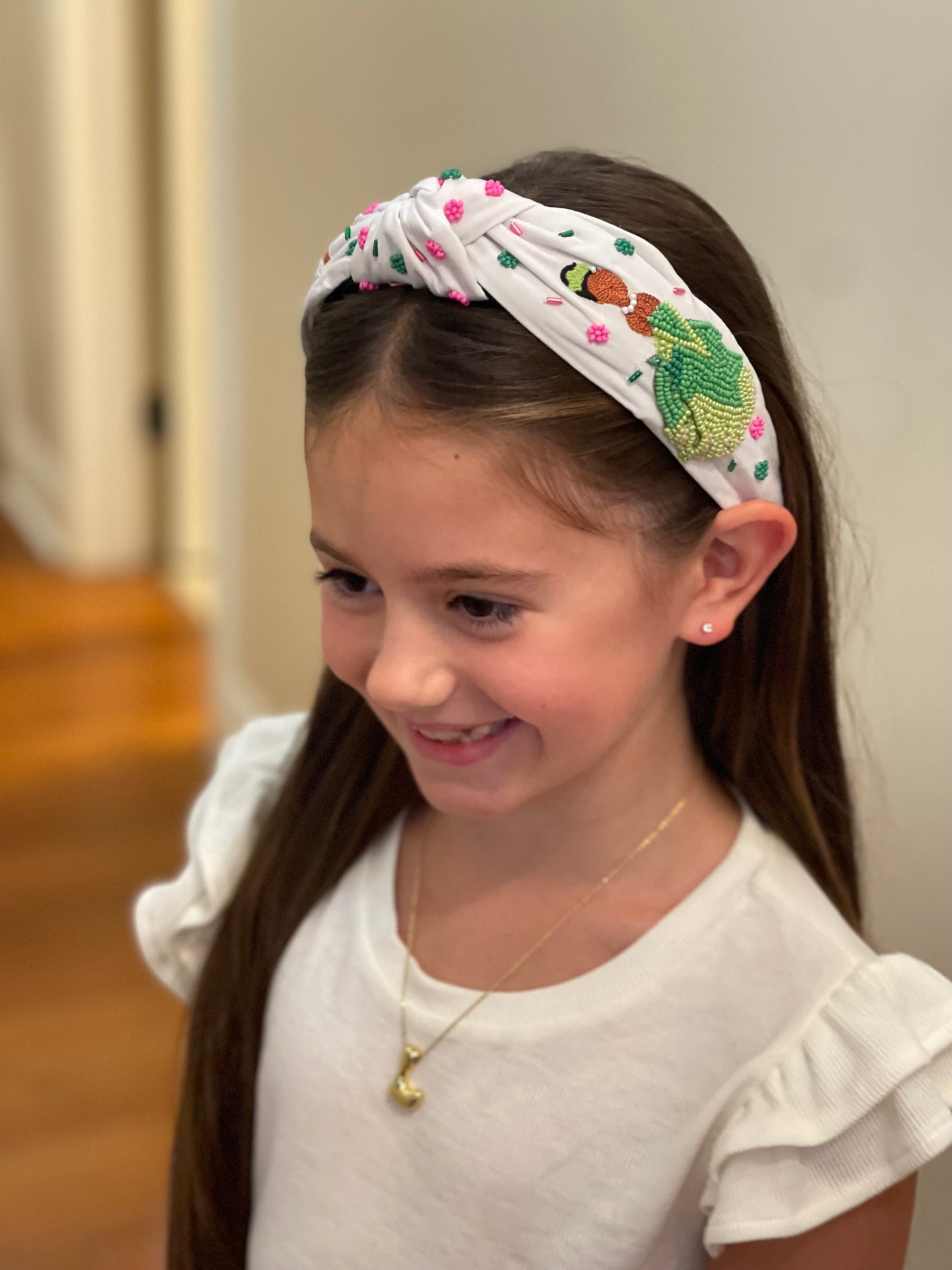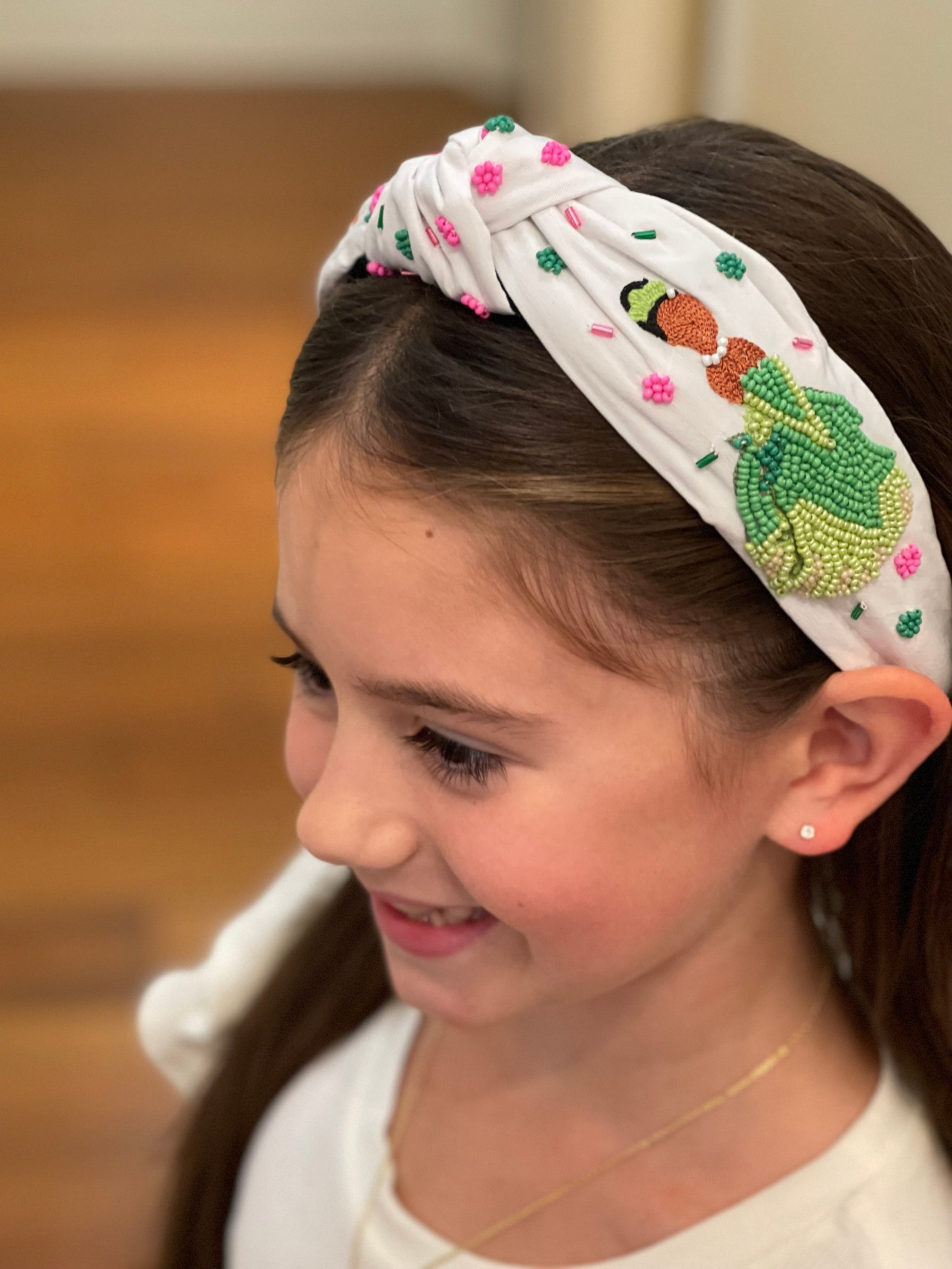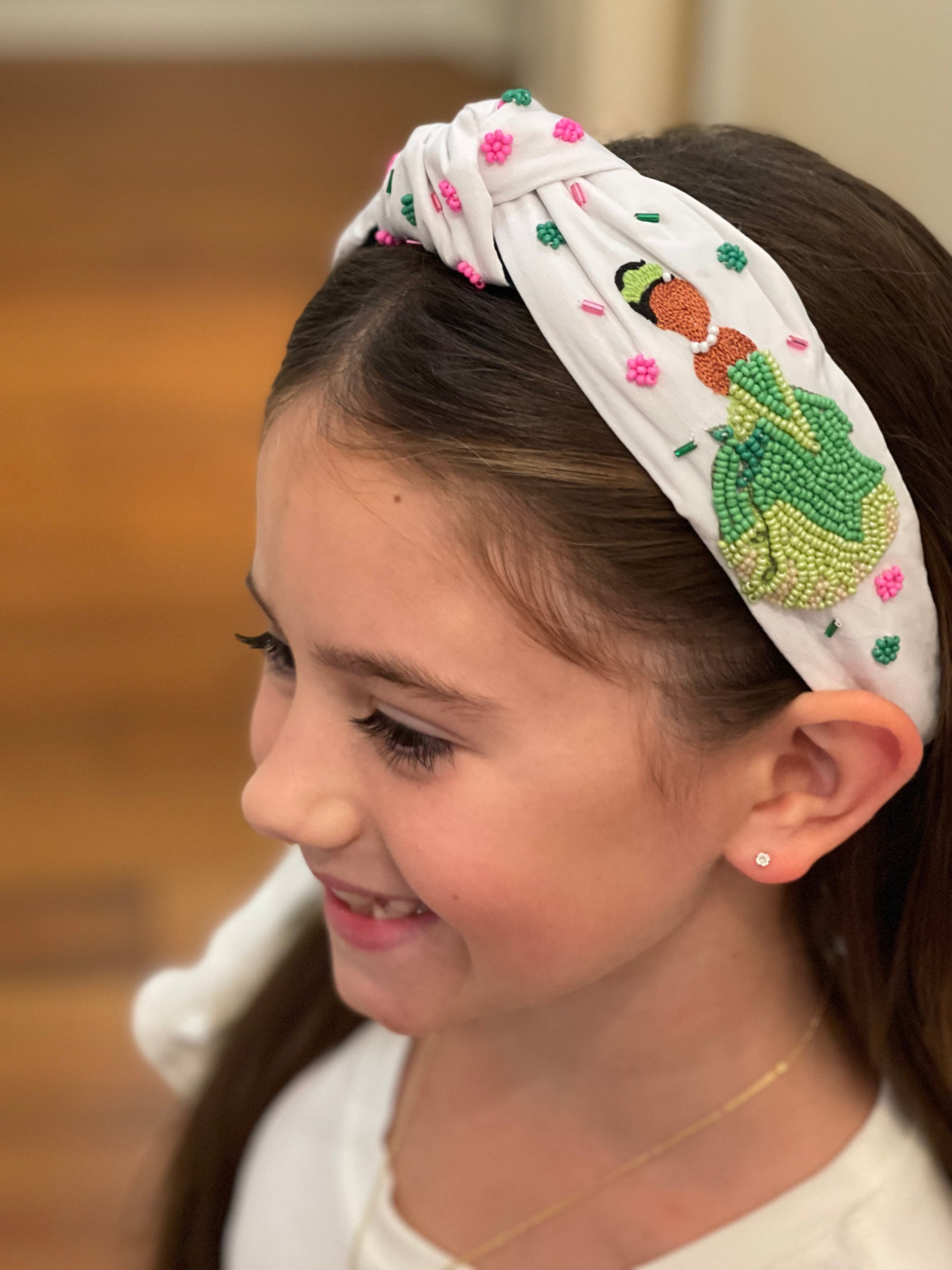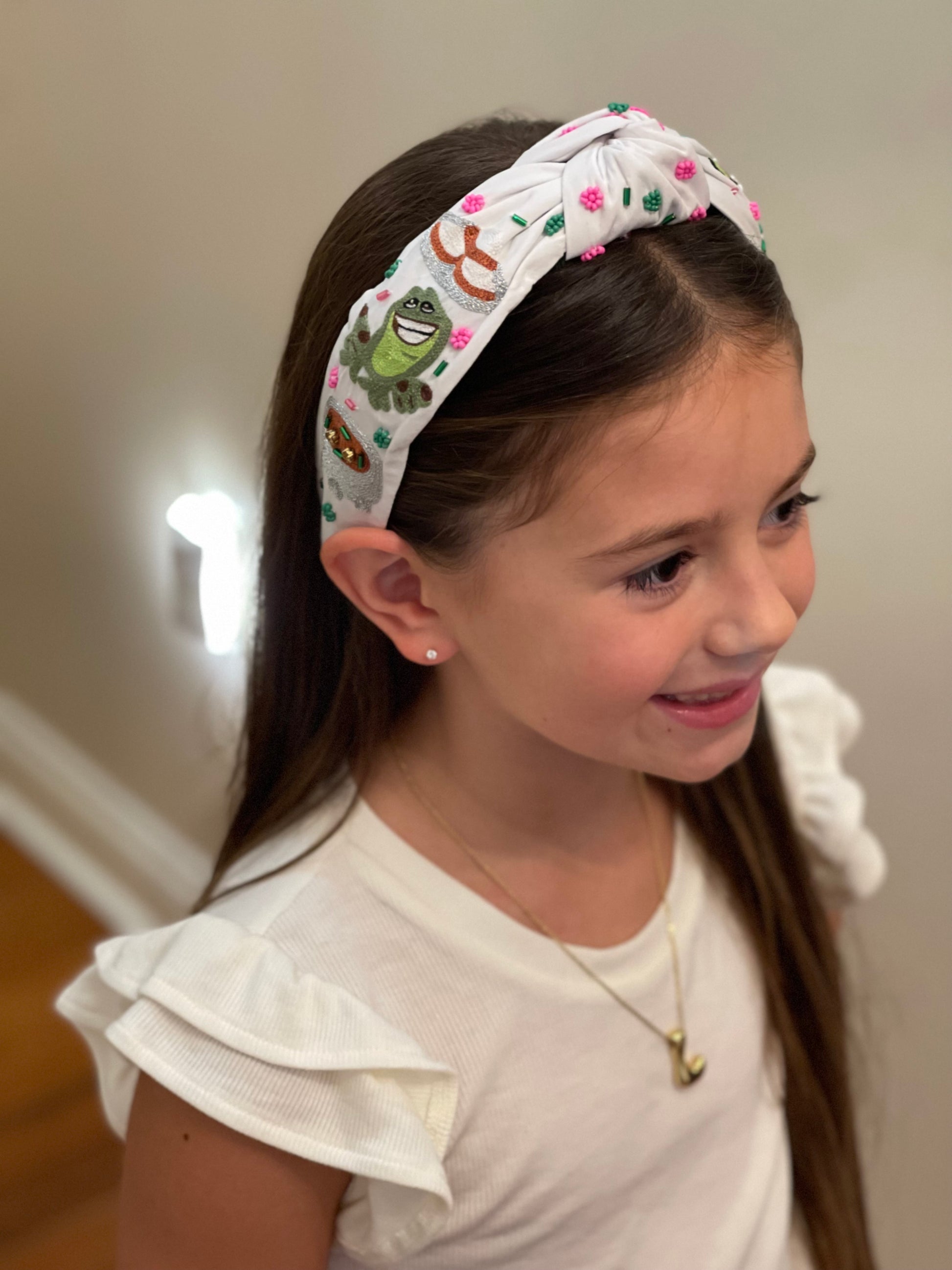 Add a touch of playful charm to your look with this whimsical embroidered headband. Featuring bright bead accents and detailed stitching, it showcases a cheerful frog, a sparkling gumbo, and a graceful princess design—perfect for anyone who loves fairytale vibes. The knotted top adds a trendy twist, while the soft fabric ensures comfortable all-day wear. Whether you’re dressing up for a special outing or adding a fun accessory to your everyday style, this headband brings a little magic and sparkle to every outfit.