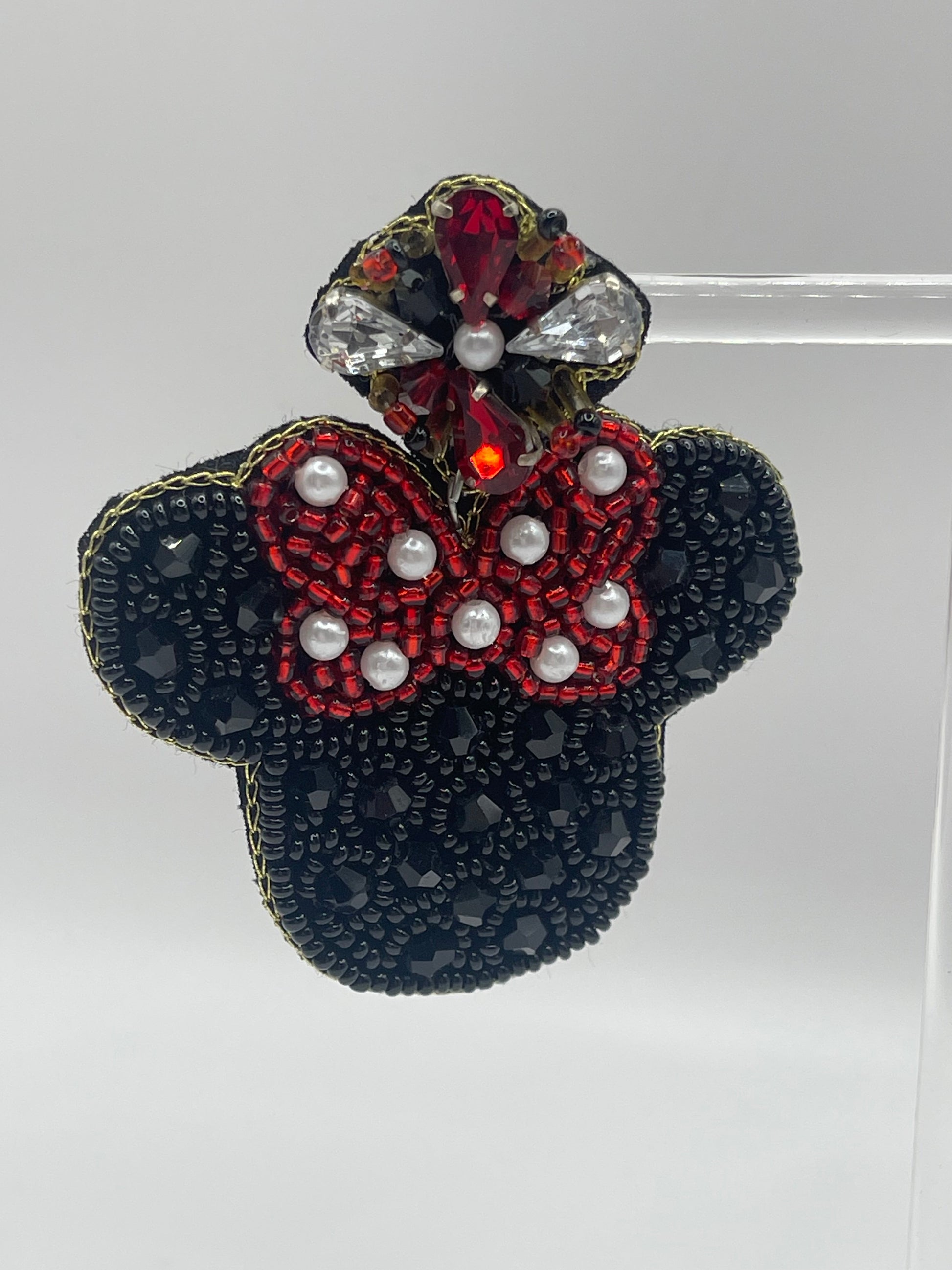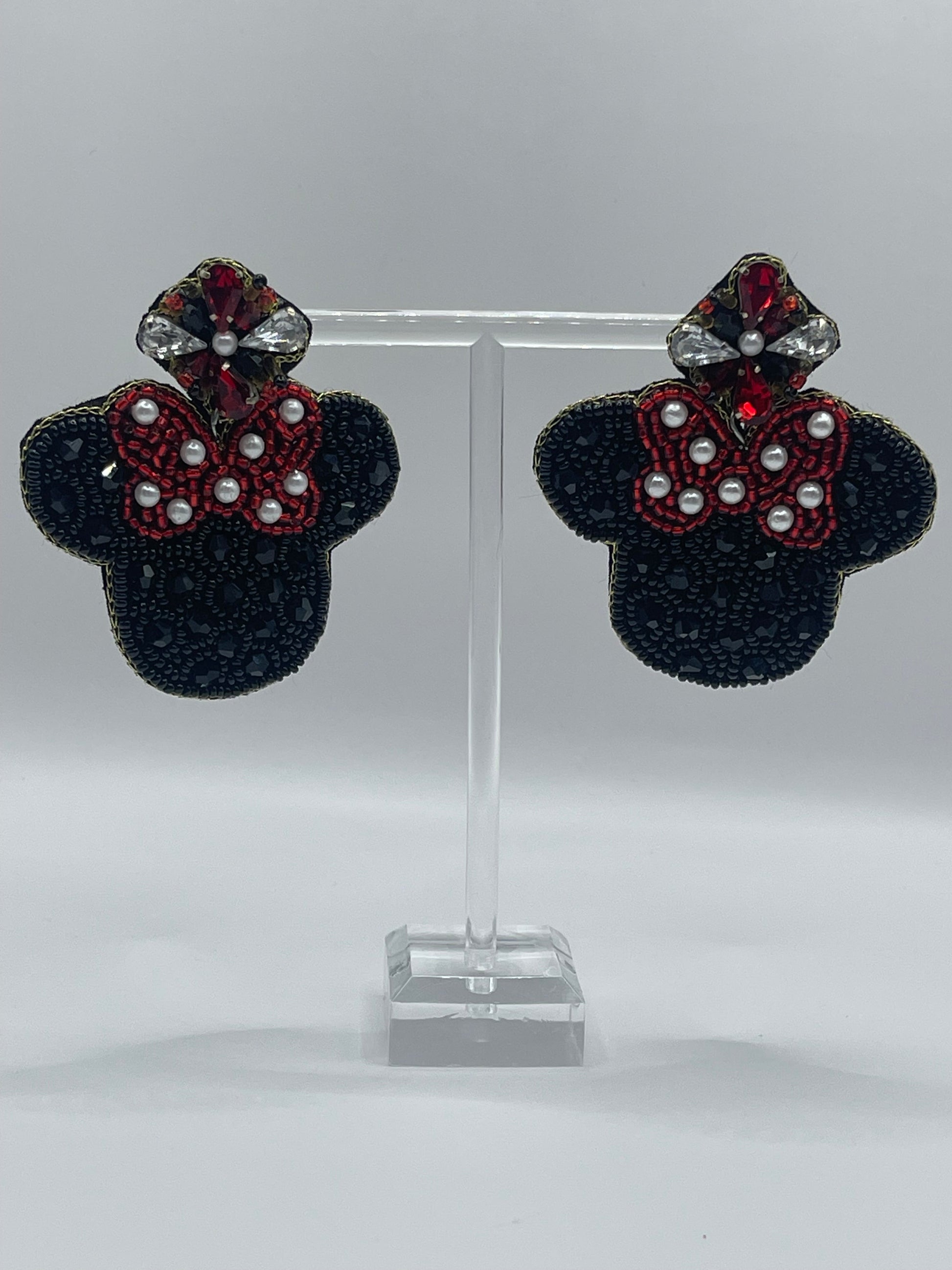 Add a touch of playful glam with our Magic Bow Moments Dangle Earrings – a dazzling tribute to timeless charm and signature style. These handcrafted beauties feature a black beaded silhouette with a bold red bow, accented by mini pearls and shimmering crystals. Perfect for park days, themed parties, or just bringing a little magic to your outfit, these earrings are finished with a soft felf backing for all-day sparkle and comfort.