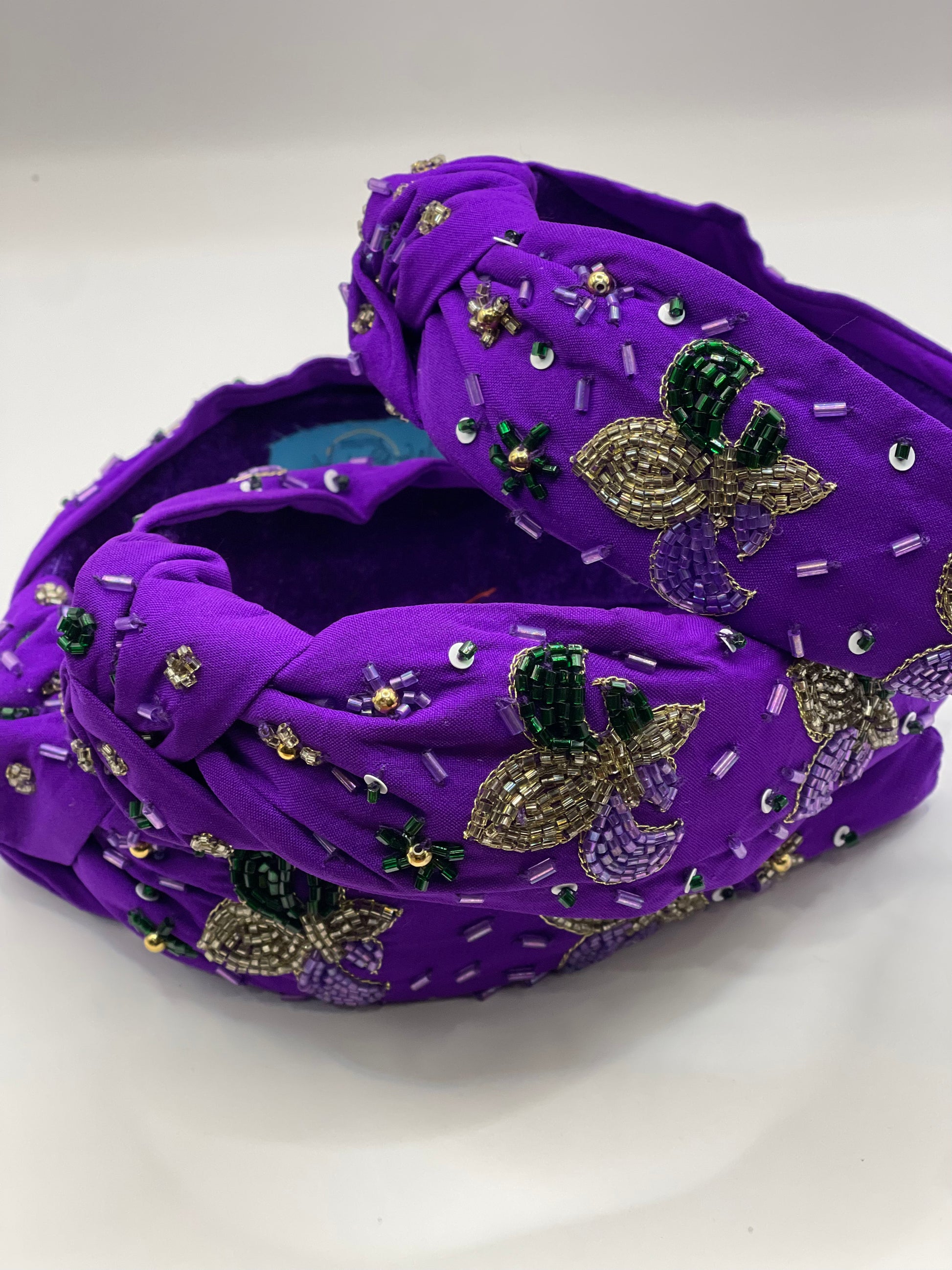 This is our purple Mardi Gras top knot Headband with beaded fleur de lis.