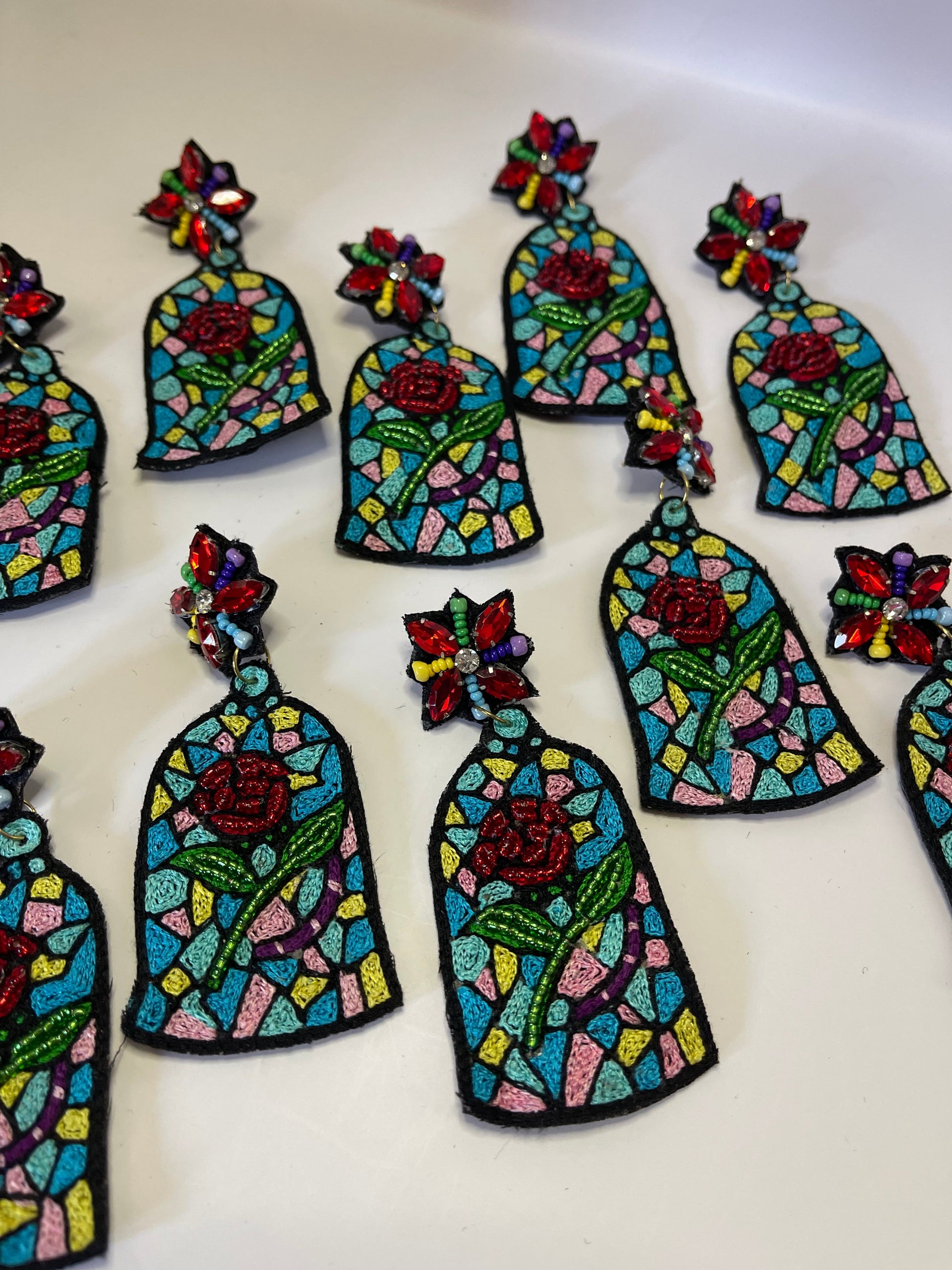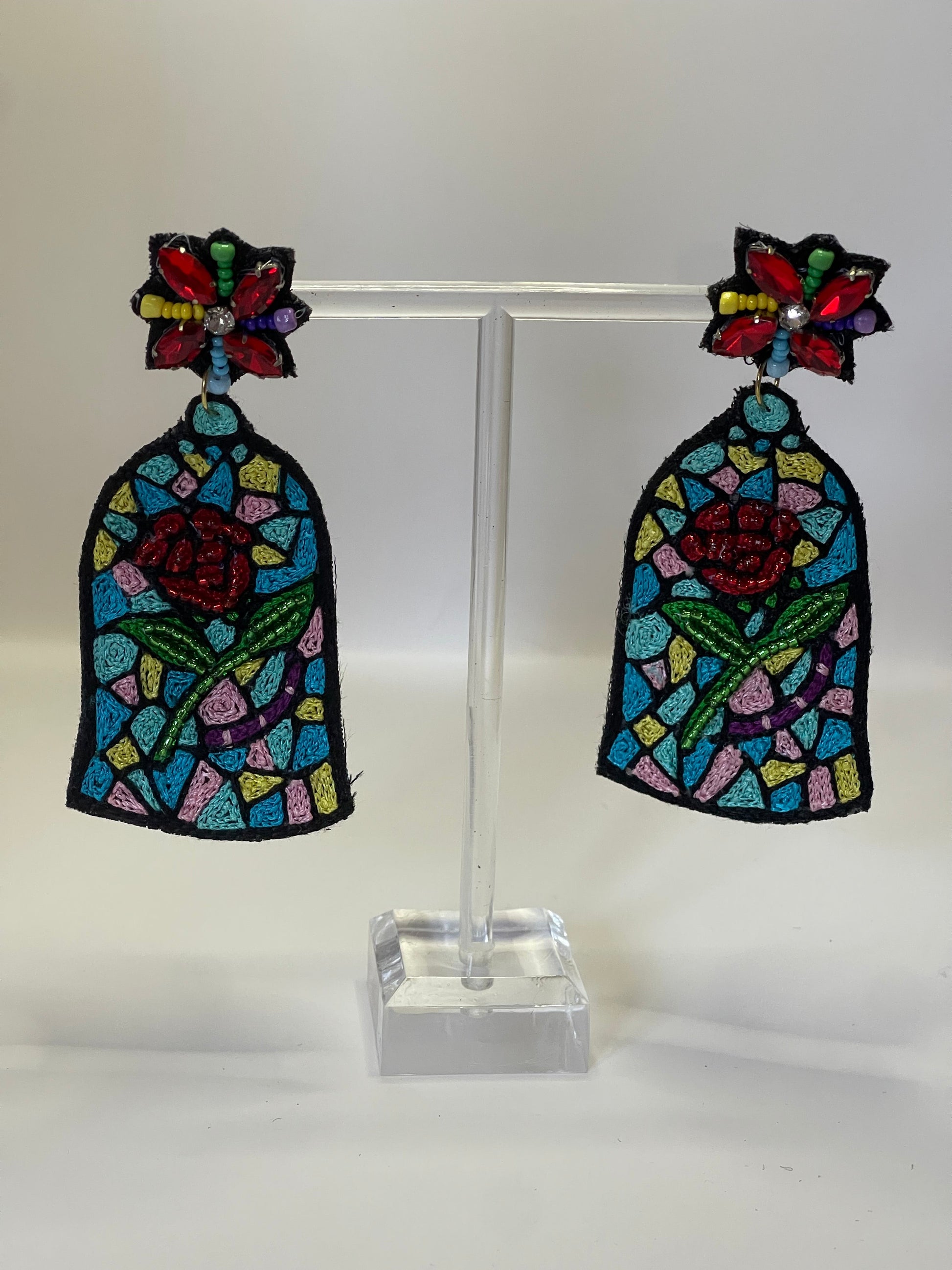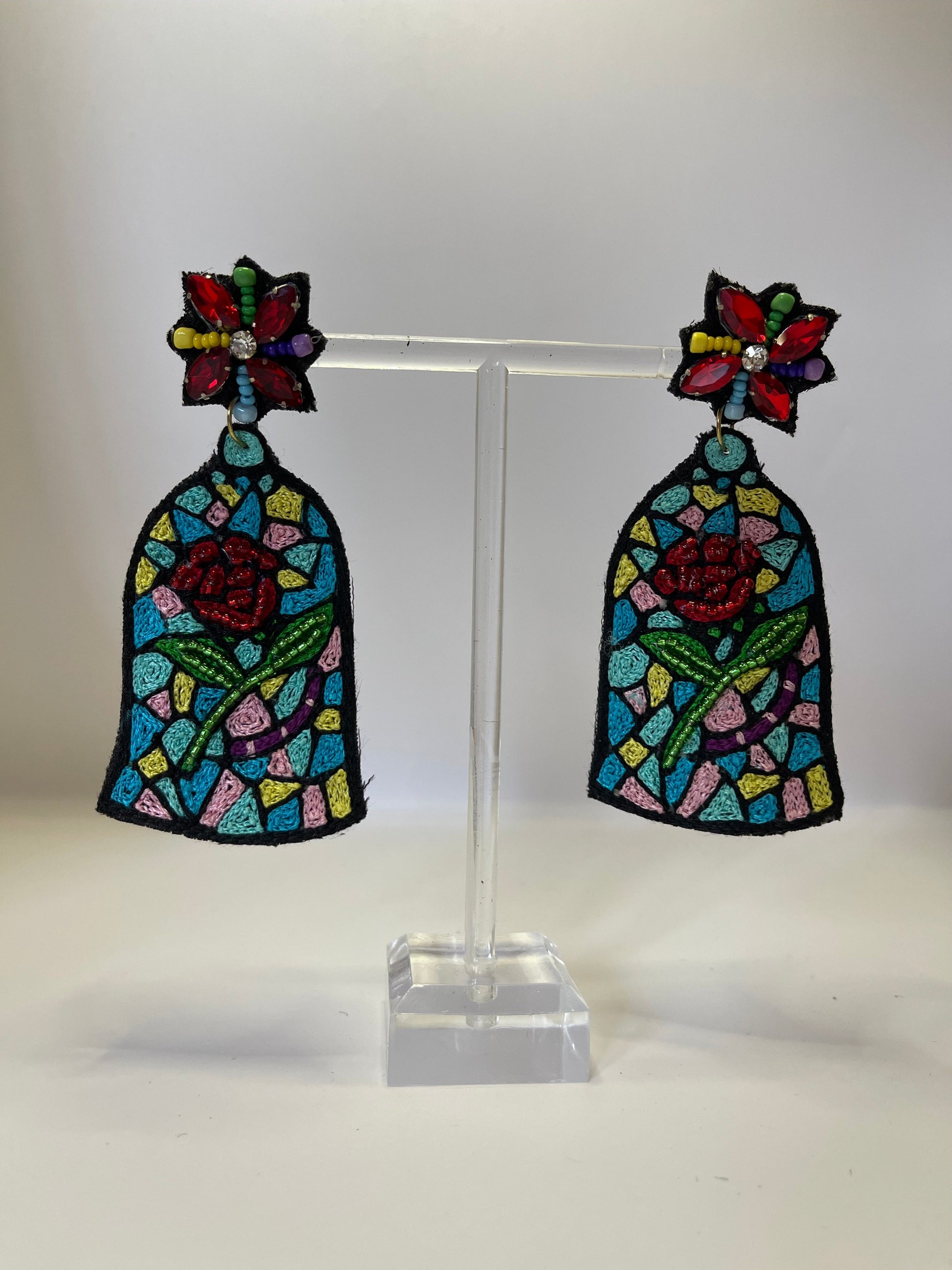 Bring timeless romance to your jewelry collection with our Stained Glass Rose Dangle Earrings. Inspired by classic fairytales and cathedral window art, these vibrant earrings feature a stunning rose design surrounded by colorful, mosaic-like beading. The dangling bell shape adds a dramatic, eye-catching silhouette, while the floral post is adorned with sparkling jewel accents for an extra pop of magic. Crafted with comfort in mind, each pair includes a soft suede backing and hypoallergenic 18K gold-plated posts—perfect for enchanting evenings or adding a bold statement to your everyday style.