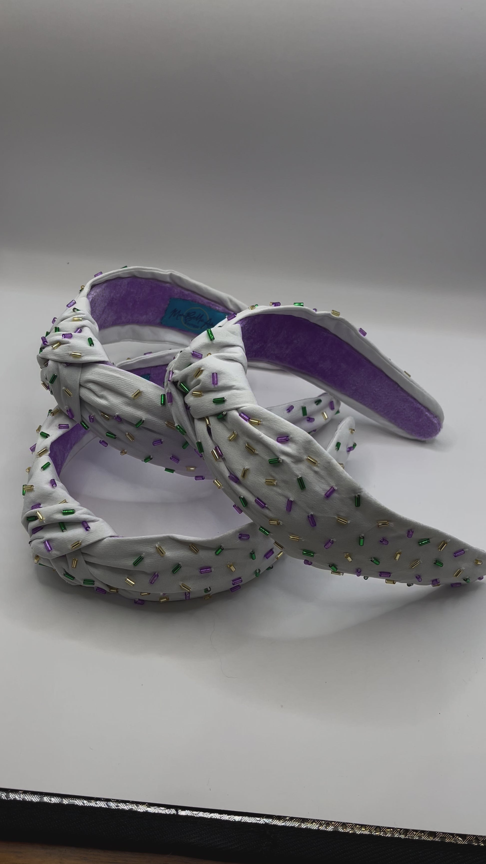 This is our white Mardi Gras confetti top knot Headband with purple, green, and gold beads.
